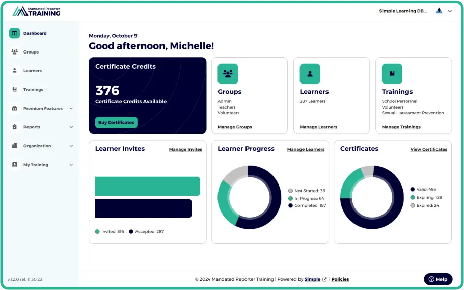 Mandated Reporter Training is making it even easier to manage your organization’s training program with a new dashboard experience. Login to your account and see your training program’s most essential metrics at a glance.